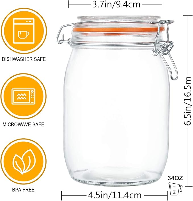 Encheng Glass Jars 32oz,Airtight Glass Food Storage Jar with Clamp Lid,1000ml Rounded Airtight Canister with Leak Proof Rubber Gasket,Clear Glass Kitchen Jars for Dry Food,Cereal,Beans,6 Pack
