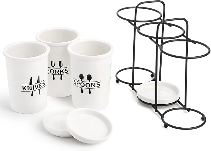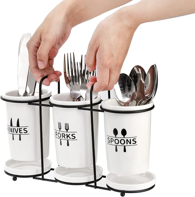 Fasmov Flatware Holder, 3-Piece Silverware Caddy Utensil Holder Ceramic Flatware Caddy with Metal Rack, Flatware Caddy White Ceramic Cutlery Organizer for Forks, Spoons, Knives
