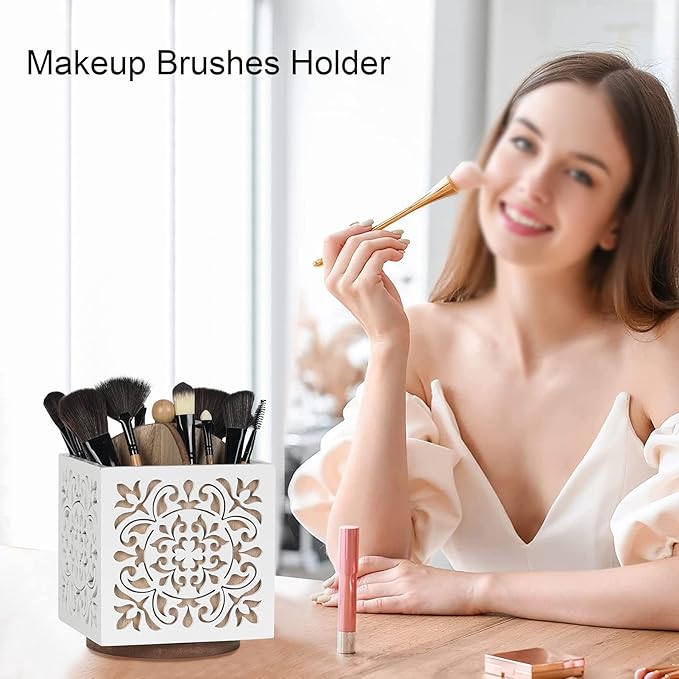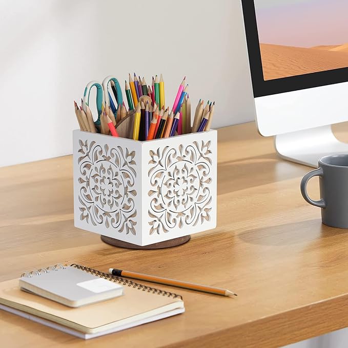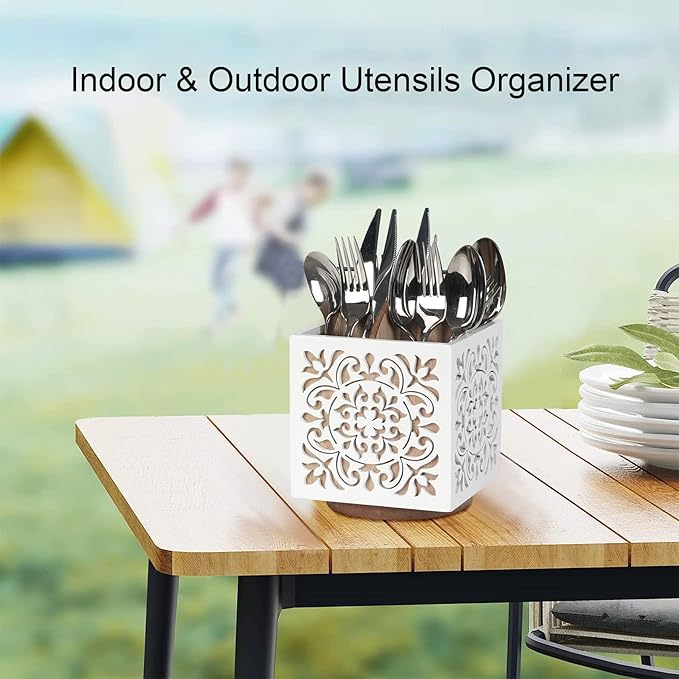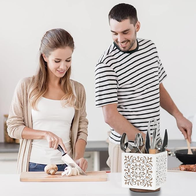 - Sturdy and Attractive : PATENT PENDING : Made of sturdy solid wood, designed with retro flower patterns, delicate white finish and superb carving craftsmanship, our utensil organizer is not only long-lasting, the classic rustic farmhouse style accent also makes it an excellent decoration for your kitchen countertop, dresser and desk