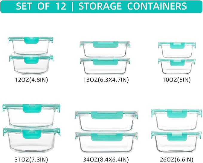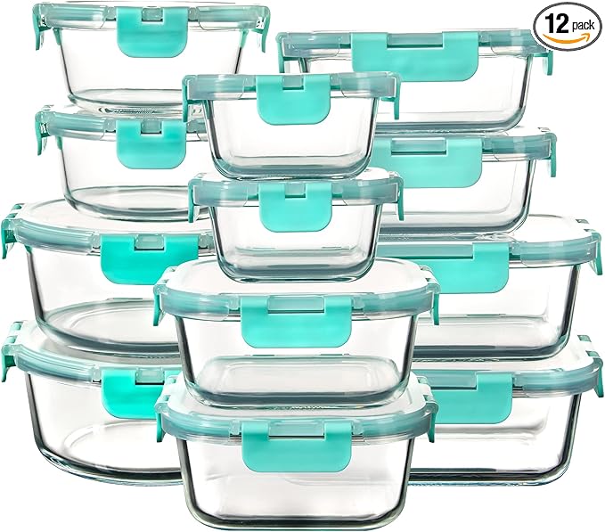 12 Pack Glass Storage Containers with Lids, Leak-Proof Meal Prep Containers, Dishwasher/Microwave/Oven/Freezer Safe Glass Food Storage Containers for Leftovers, to Go