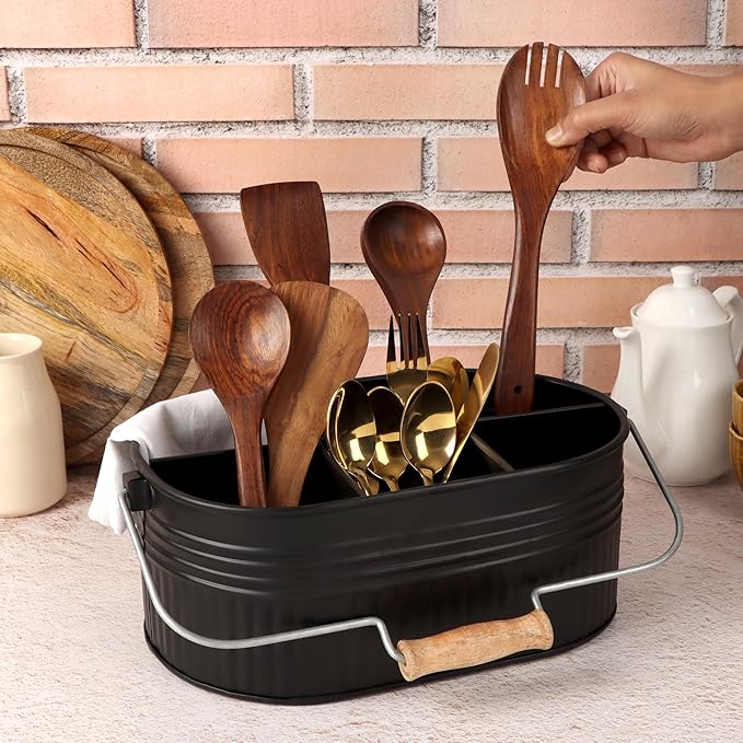 - EASY GRIP :- With an wooden handle support, you can easily carry the flatware organizer around to bring drinks to your guests or place in the center of a table offering a comfortable holding point and carrying experience.
