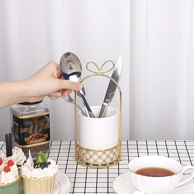- Our ceramic and metal silverware holder is the perfect blend of materials, perfectly combining white ceramic against golden metal rack, look simple and stylish on kitchen dining table.