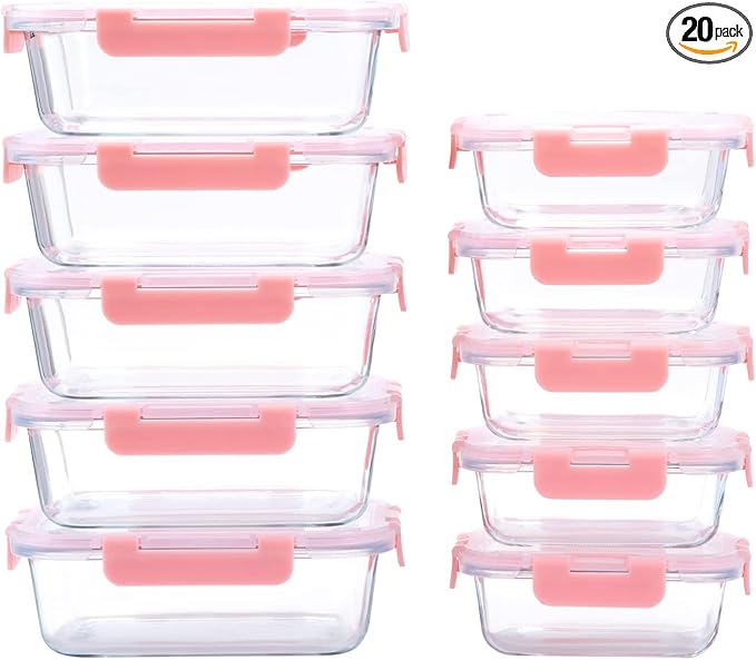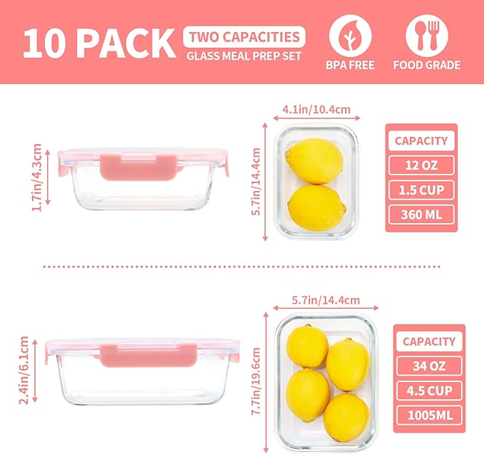 - 【10 Pack Glass Storage Containers】Set includes (5) 1.5-Cup and (5) 4.5-Cup Rectangular containers, plus lids, for a total of 20 pieces