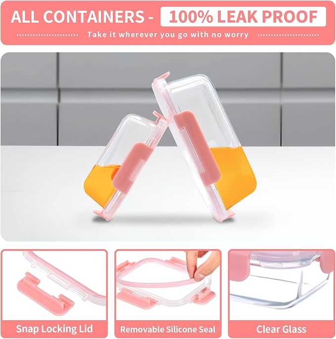 - 【100% Leak Proof Airtight Lid】Glass food containers is designed with removable silicone seals and 4-hinge snap locks to ensure zero leaking or spilling, which also prevent smell go out and keep food fresh.