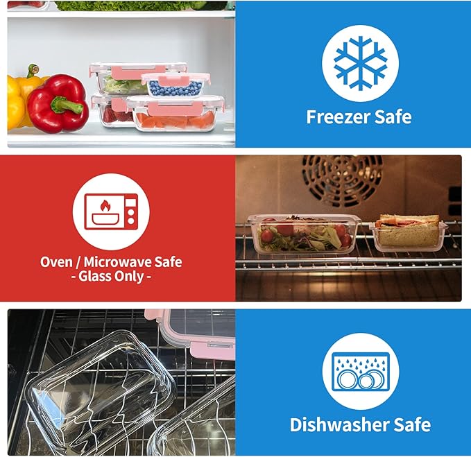 - 【Oven/ Microwave/ Freezer/ Dishwasher】 the glass containers are made of high-quality borosilicate glassis able to withstand -4℉ to 752℉ (-20℃ – 400℃), hold up very well from refrigerator direct to microwave.