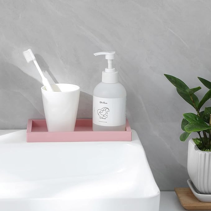 - MULTIPURPOSE: The bathroom counter tray can be used anywhere. It is not only a sink tray for dish soap dispensers, hand soap, sponge, scrubber, lotion bottles, but also a vanity tray for dresser tops to organize trinket, perfume, cologne, makeup, a toilet tank tray, or a desk accessory for keys and other small life essentials.