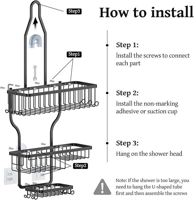 - Non-Slip Bathroom Organizer - Thanks to the anti-slip rubber circle on the top of the shower hanger and wall fixing accessories (1 suction cups and 2 adhesive), the shower hanger remains stable even when the shower organizer over shower head is filled with bottles. The two wall fixing methods can apply to a variety of walls, and you can choose one of them according to your needs