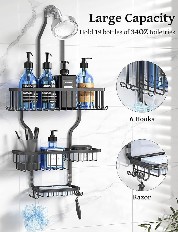 - Clean Up Your Shower Space - The hanging shower organizer comes with 3 baskets and 10 hanging hooks. The top 2 baskets are large enough to store shower gel, shampoo, and body lotion. The bottom soap basket is ideal for soap storage. 10 hooks hang razors, loofahs, toothbrushes, and towels, the hanging shower organizer maximizes your shower storage space and keeps your toiletries in order. Dimensions: 13×5×27.5 inches (L×W×H)