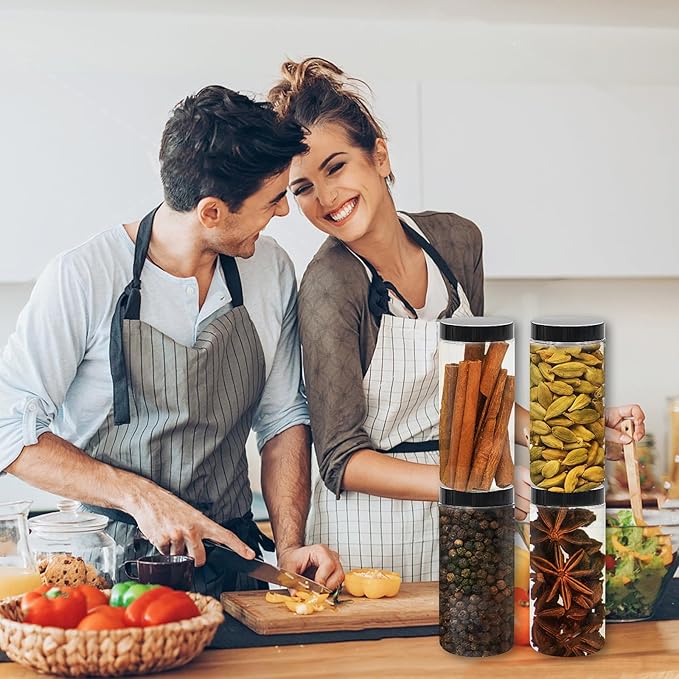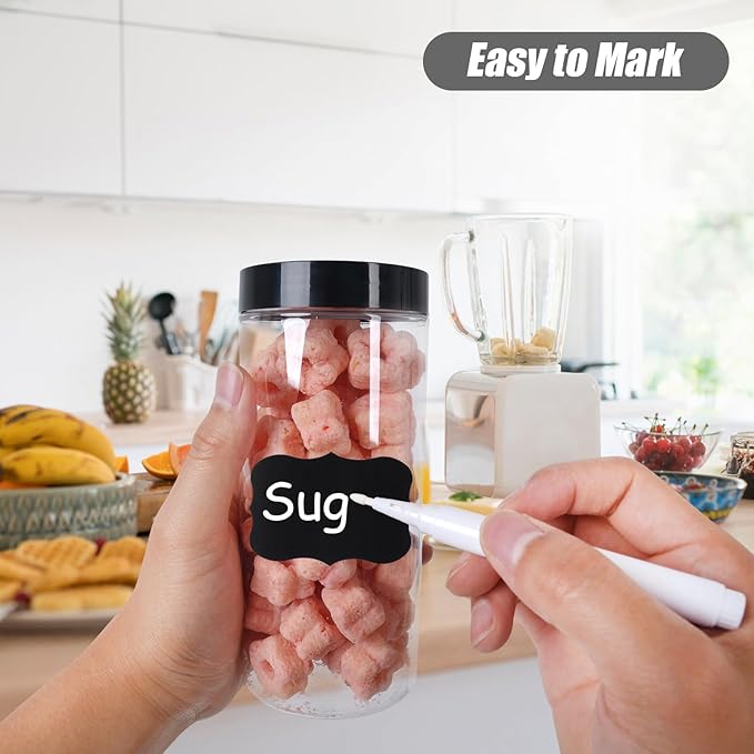 - Package Includes: Package come with 16pcs 16 oz plastic jars with black lids,each plastic jars with lids measures 2.8” W x 6” H , Capacity: 500ml,also including 16pcs labels and 1x marking pen,which can help you to figure out what items inside the jars and make a quick choice