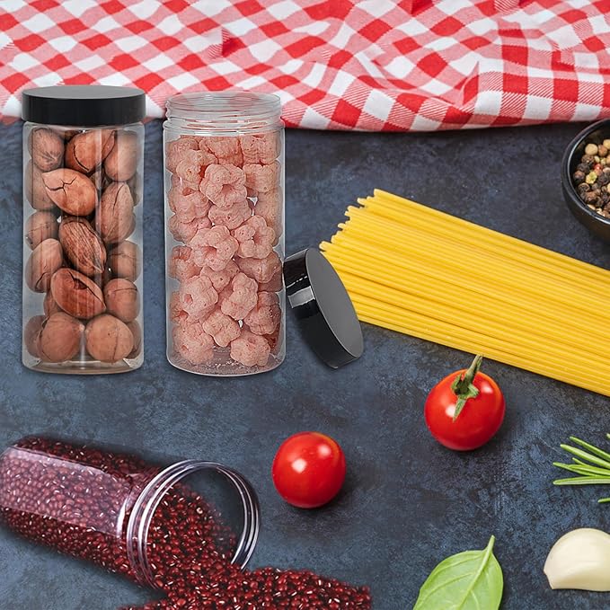 - Multi-functional Plastic Jars with Lids:These 16 oz plastic containers with lids are perfect for kitchen, pantry or household to store dry foods,rice,coffee beans,nuts,cookies,herbs ,teas ,snacks and spices.Use these plastic jars for dog and cat food storage.These plastic jars with lids are also great for playroom, garage and bathroom use. Can also use in the utility room for nuts & bolts.Our plastic storage containers are enough to satisfy your diverse needs and make your home organized