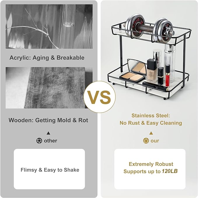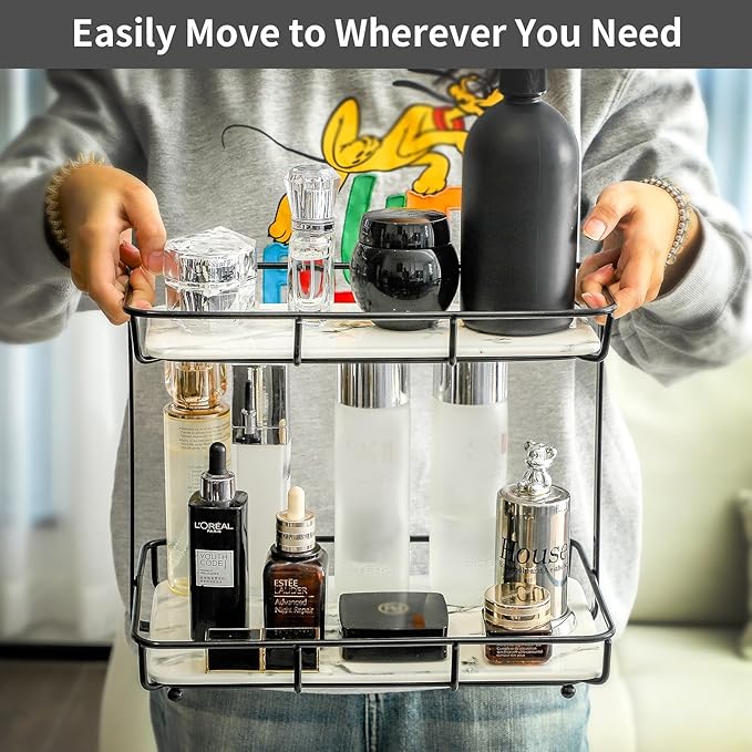 - EASY TO CLEAN: With a sturdy stainless steel frame that can prevent corrosion in wet places and removable ceramic trays with a luxurious marble pattern, this dresser top stand is both functional and easy to clean.