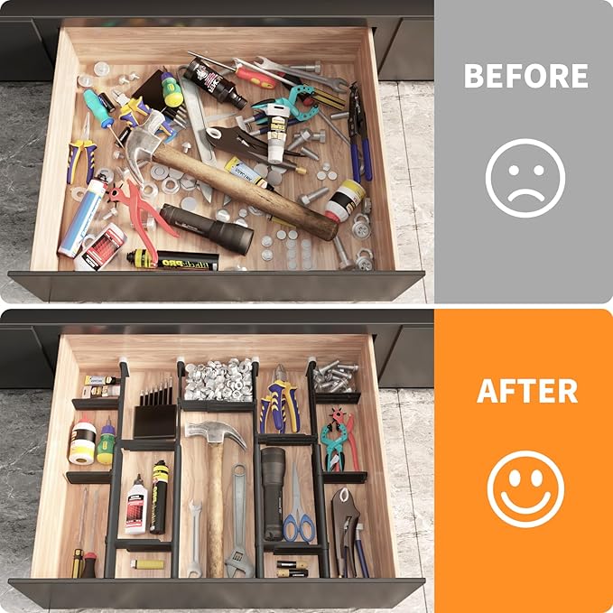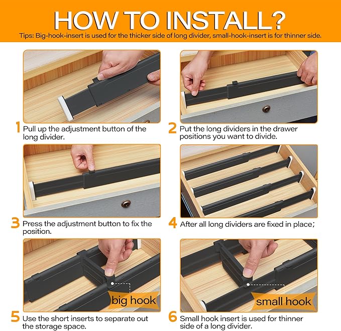 - Long Lasting & Stable Grip: To ensure the most lasting stability of the dividers, we adopt the serrated design to fix instead of the spring structure on the market. So there is a pull tab on the long divier which need to be pushed from the bottom to the top with our thumb. There are also foam pieces covered on kitchen drawer dividers that are a nice touch for grip. Protect the drawer from scratches, leaving no traces or residues