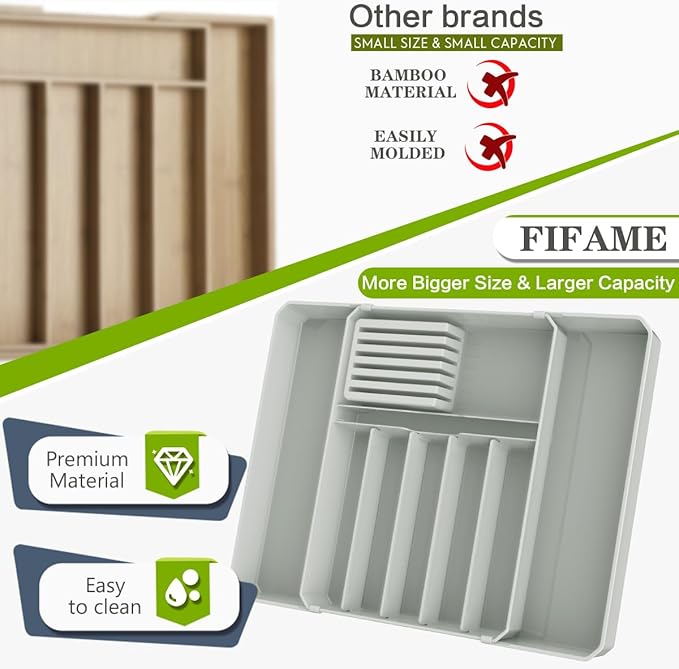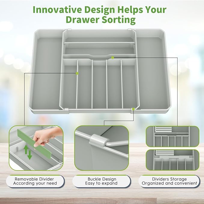 - 【Largest Capacity on The Market】: Organize your kitchen drawers with this silverware utensil organizer to make your kitchen neater and save space. The left and right sides are expandable panels that can be adjusted to suit your needs. Adjustable Width Between 13''-22.8''.