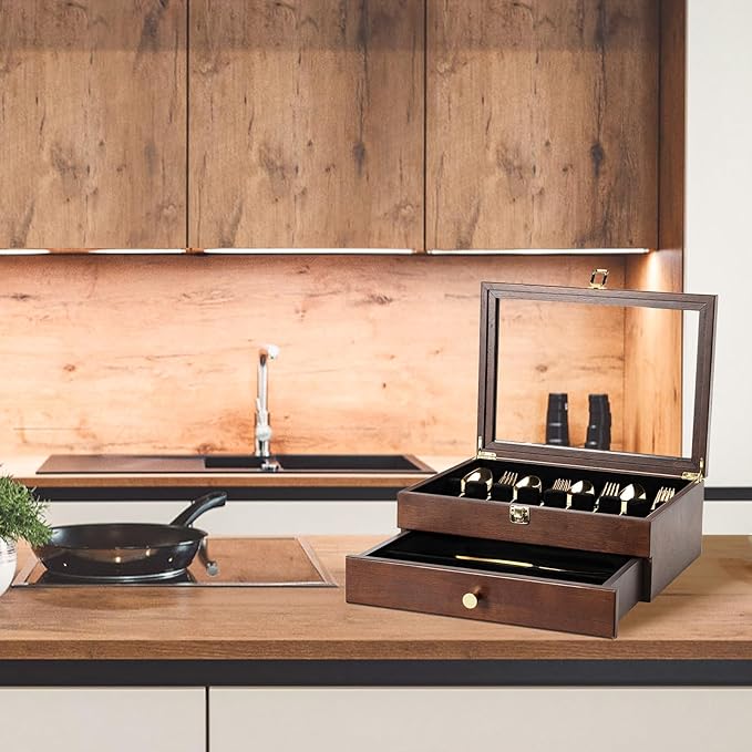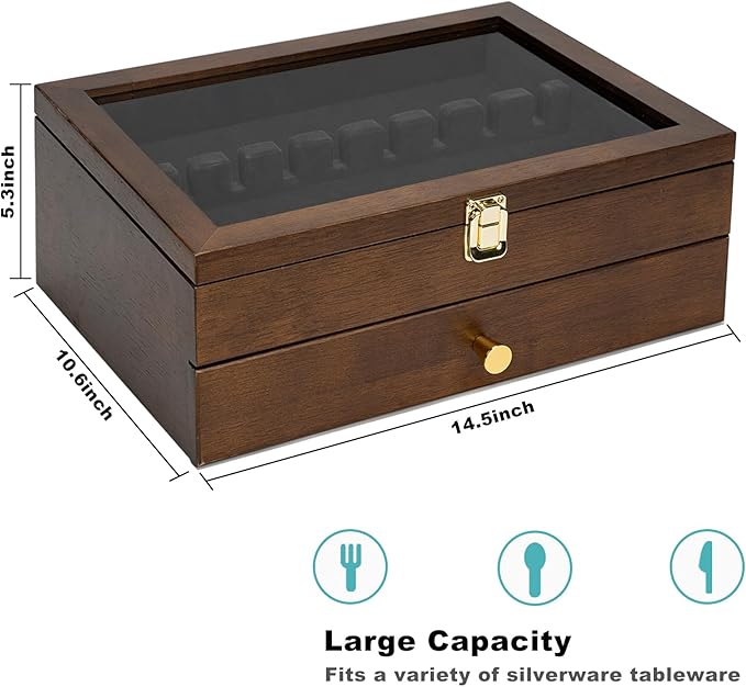 - Premium Silverware Organizer Case: Under the clear glass lid of this silverware organizer , all of your favorite silverwares are visible at a glance and well-protected from dust and provides plenty of space for organizing daily utensils or storing fine silverware that’s used for parties or special occasions.