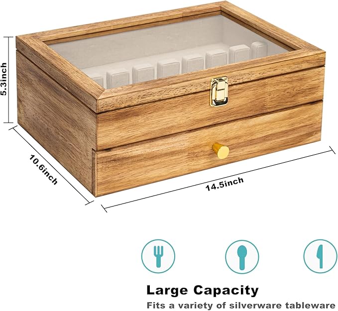 - Premium Silverware Organizer Case: Under the clear glass lid of this silverware organizer , all of your favorite silverwares are visible at a glance and well-protected from dust and provides plenty of space for organizing daily utensils or storing fine silverware that’s used for parties or special occasions.