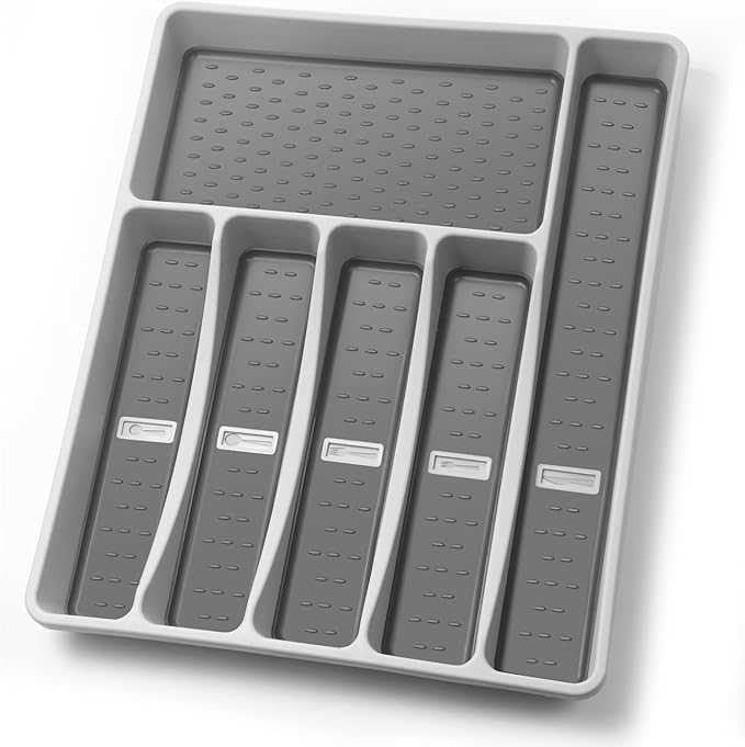 - 6-Compartment Flatware Organizer With Cutlery Icons:Still keeping your cutlery cluttered in your kitchen drawer?This cutlery tray with cutlery icons will really help you!It provides the perfect habitat for knives, forks and spoons and other kitchen necessities, and comes with icons to help you better store and sort,with this you will find that your kitchen drawers will be neat and organized.
