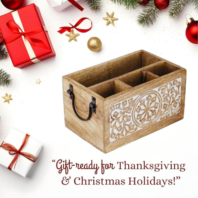 - DESIGNER WOODEN CADDY: Made of natural Mango Wood that is durable and environment friendly. It's sturdy construction and White floral hand carving on the front adds an elegant touch of style to your space while promoting clutter-free living.