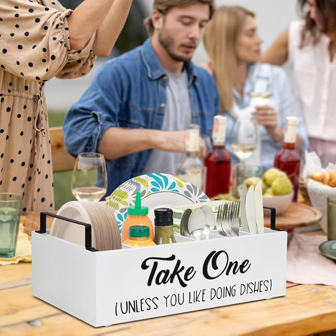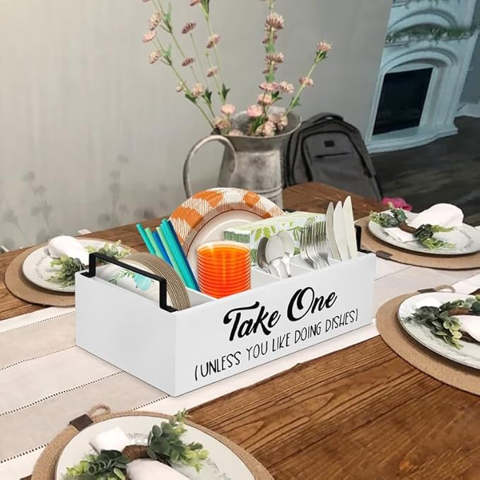 - 🥄NATURAL MATERIAL PAPER PLATE CADDY: Farmhouse style paper plates holder is made of solid wood with smooth hand feel and fine workmanship. This wood silverware caddy is more durable and will resist any deformation, bending or scratching, not as easily breaking as ceramic or plywood. The classic black and white color scheme complements any theme or decor, our paper plate caddy is suitable for the people who own a cozy and rustic style kitchen.