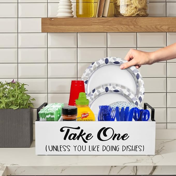 - 🍽️SPACE SAVING UTENSIL CADDY HOLDER: If you are still worried about not having enough space to store kitchen utensils and plates, it's time to use this paper plate caddy holder to store your spoons, knives, forks, plates, napkins and other kitchen accessories. Also can hold some everyday condiments like salt, pepper, ketchup, mustard, etc. Our paper plate holder organize all your utensils in one place, convenient for you to pick up any itemsaving you space, stress and time!