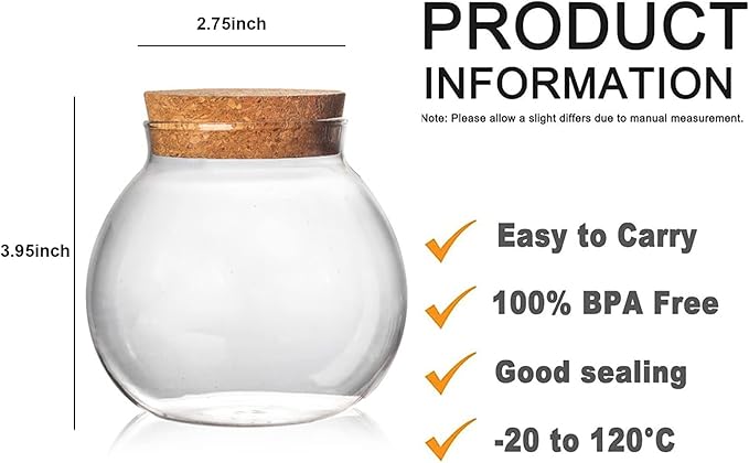 - 【Material】: Made of transparent borosilicate glass, no peculiar smell, the sealing lid is made of cork, the sealing is very high, and the food can be stored inside for a long time.