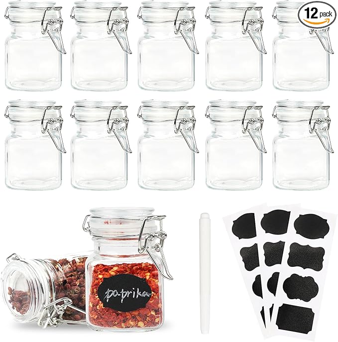 12 Pack Glass Jars with Airtight Lids, 3.4 oz Small Spice Jars, 12 Pack Empty Mini Glass Bottles with Silicone Gasket, Herb Containers with Chalkboard Labels and Marker for Kitchen