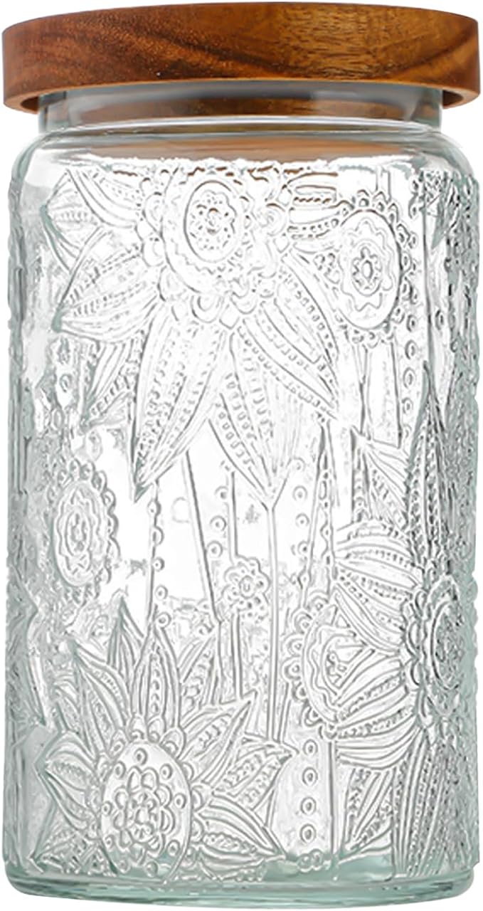- 【VINTAGE GLASS JAR】Sunflower, begonia, window patterns and random wood grain lid of retro storage jar create a retro and unique decorative effect, transparent glass makes it easy to check the status and amount of food left over, practical and can decorate kitchen counter pantry and living room.