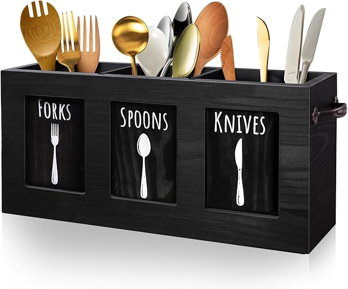 - 【Kitchen Essential Storage Box】Our farmhouse-style utensil holder is made of 100% solid wood material, making it more sturdy and durable. It has three compartments with labels and pictures of forks, spoons, and knives, keeping your kitchen tools organized. ***Note: Packaging does not include any cutlery!!!