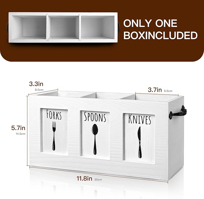 - 【Fashion Kitchen Utensil Storage Box】 MINCORD silverware holder measures 11.8"L x 3.3"W x 5.7"H, providing ample space to store your utensils and cutlery. This wooden white utensil organizer takes up minimal countertop space and can be used on dining tables, in dining rooms, patios, or any tabletop surface where you need to display items.