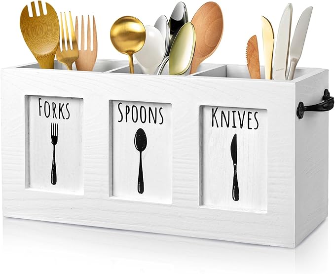 - 【Kitchen Essential Storage Box】Our farmhouse-style utensil holder is made of 100% solid wood material, making it more sturdy and durable. It has three compartments with labels and pictures of forks, spoons, and knives, keeping your kitchen tools organized. ***Note: Packaging does not include any cutlery!!!