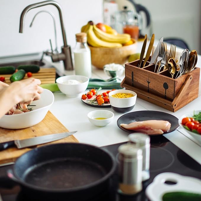 - Acacia Wood Material: crafted from quality acacia wood, this wooden utensil organizer not only showcases its natural wooden color, but also ensures longevity; The acacia wood material is known for its resistance to water and scratches, making it suitable for everyday use