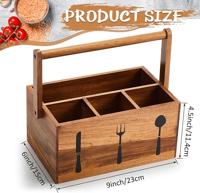 Geetery Acacia Utensil Caddy Silverware Caddy with Handle Wooden Multipurpose Countertop Flatware Napkin Utensil Organizer for Party Picnic Kitchen Trip, 9.1 x 5.9 x 4.5 in(Wood Color)