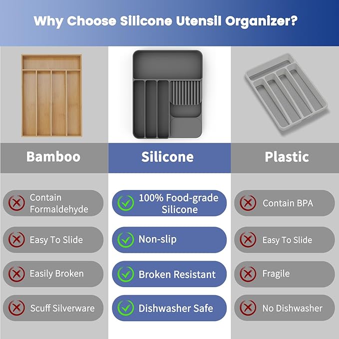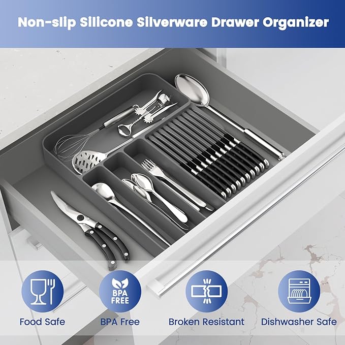 - 【Moisture Resistant & Durable】Compared with other flimsy drawer organizers, our silicone utensil organizer is more flexible and resistant to moisture, holding more silverware and protecting your utensils from damage and scratches.