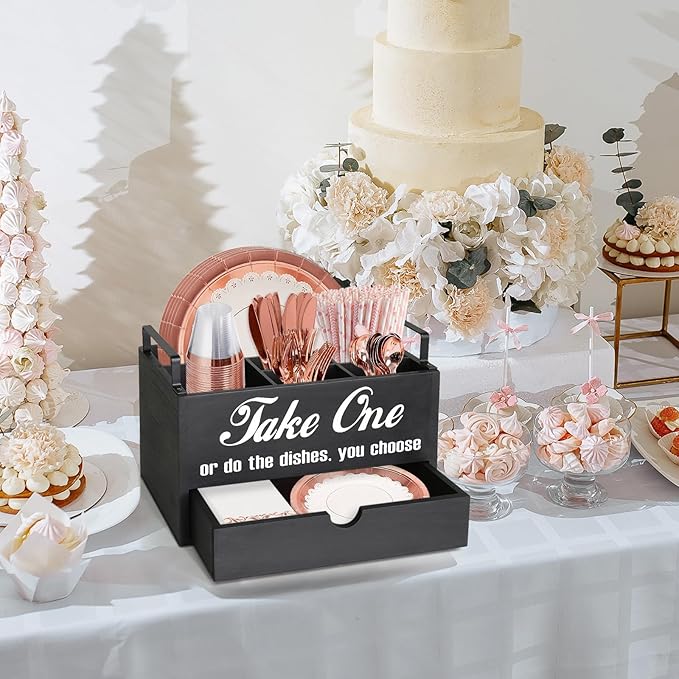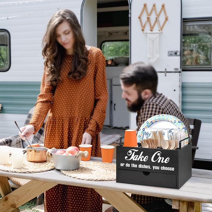 - 【Convenient to Carry Paper Plate Holder】The flatware organizer is thoughtfully equipped with two metal handles, which are convenient to carry around and suitable for utensil organization and storage in camping, parties, buffets, BBQ and other outdoor scenarios. With white cute print "Take one or do the dishes, you choose" the paper plate organizer for party can not only decorate the party but make your friends and guests feel the humor of the host, adding a cheerful atmosphere to the party