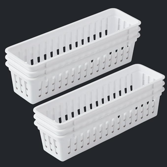 - In the bathroom, drawer storage baskets and trays are great for organizing toiletries, makeup, brushes, and other grooming supplies, helping to create a clean and clutter-free space.