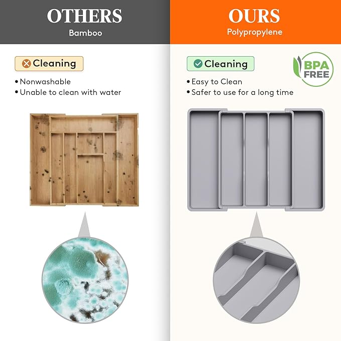 - Safe to Use: Crafted from BPA-free PP material, this cutlery drawer organizer guarantees the safety of all your utensils, silverware, and flatware. Cleaning is a breeze as well - simply rinse with water to remove stains.