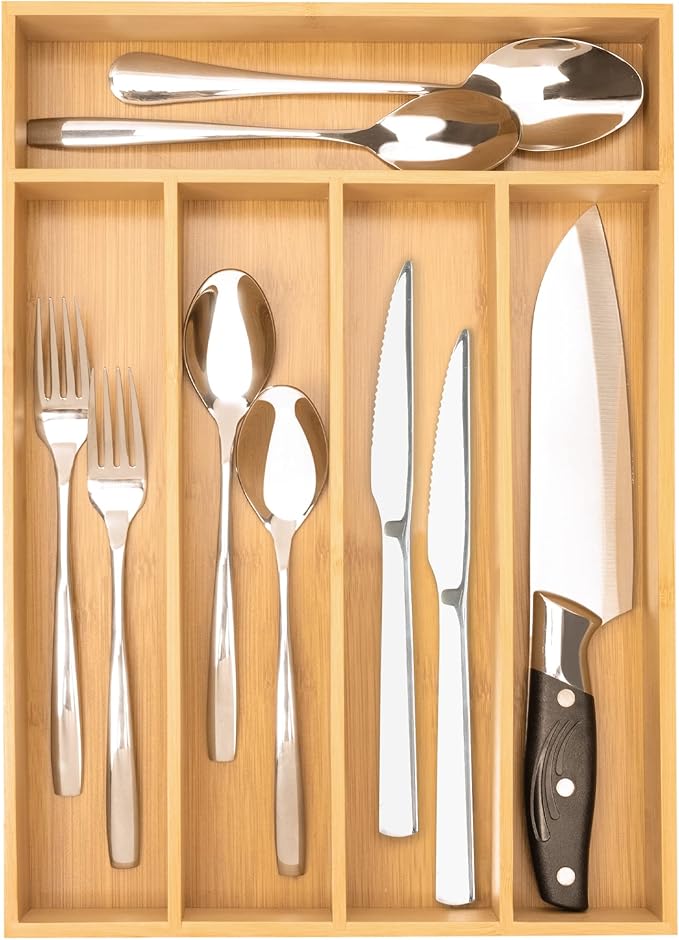 - 【Sturdy and Well-made】Our silverware tray for drawers is crafted from aged bamboo, making it highly durable for long-term use. The eco-friendly material ensures that your flatware and utensils remain resistant to water and odors. Additionally, the silverware tray's design even prevents knives from leaving scratches. Unlike plastic and metal, our bamboo kitchen drawer organizer boasts a classic and natural aesthetic. Its color and texture are 100% natural and consistent throughout, adding elegance to your kitchen.