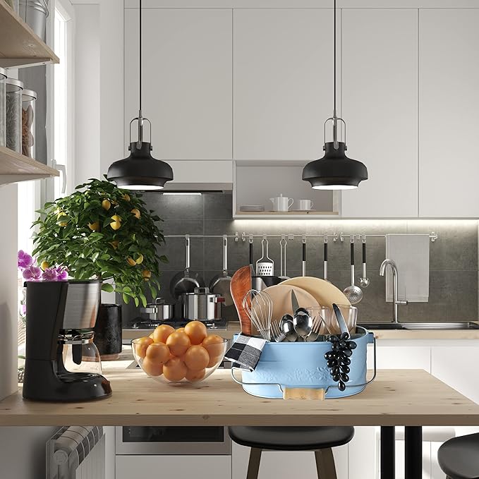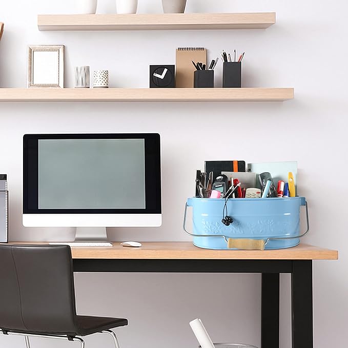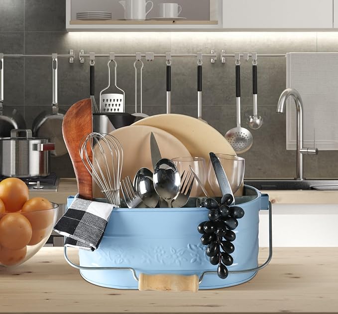 - PERFECT FOR EVERY PLACE : Anniversary, Holiday Housewarming or Birthday, Mother’s Day, wedding, bridal shower, or anything in between, this galvanized carry all makes a cute and functional gift. It looks great in the kitchen, living room, bedroom, office, bathroom or kid’s room. holding your hair brushes and curling irons in the bathroom, and even for cleaning supplies or gardening tools and accessories.Offering sufficient space, you can store your forks, spoons, kitchen gadgets, spatulas, utens