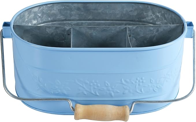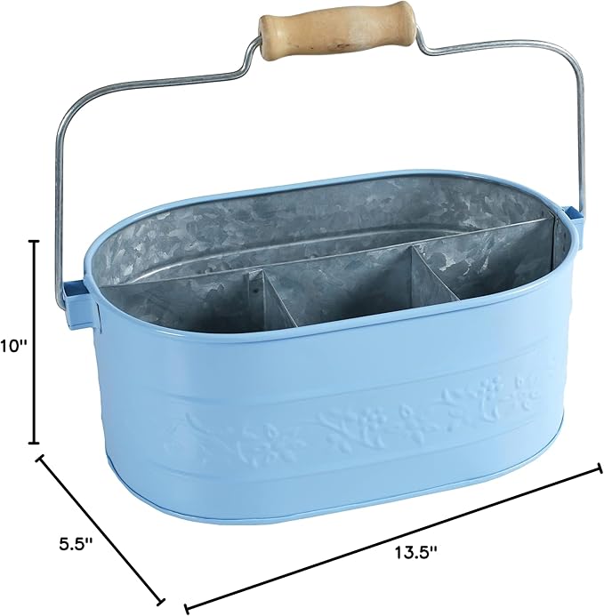 Light & Pro Farmhouse Rustic Utensil Caddy Carry All Serveware Galvanized Metal Organizer - Wooden Handle Storage Bin Caddy For Flatware, Condiments, Party Curtlery - Flower Design - Sky Blue
