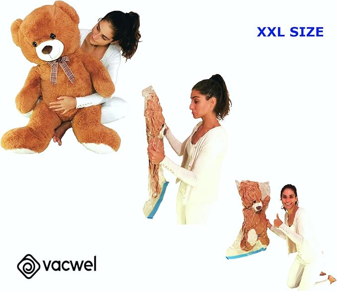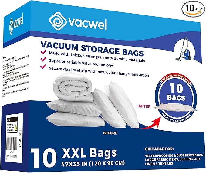 - MORE SPACE FOR LARGER ITEMS: If you're tired of struggling to find storage space for bulky items like comforters, duvets, and large cushions, then Vacwel's XXL vacuum storage bags are the perfect solution for you. With a size of 47 x 35 inches, these bags are the largest suction space savers on the market. Whether you're storing or moving, these vacuum bags make it easier than ever to keep your home clutter-free and organized.