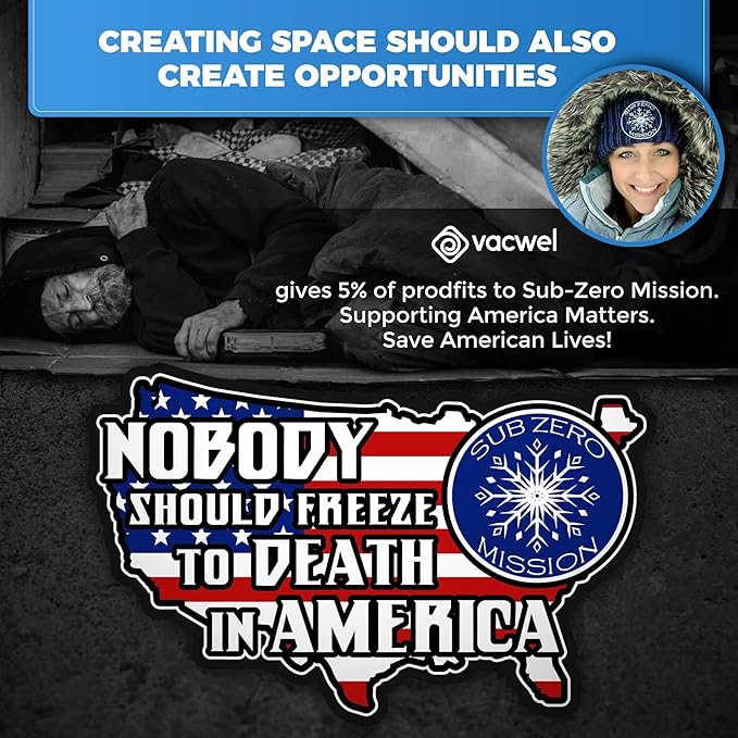 - GOODWILL: Creating space with Vacwel also creates opportunities! Vacwel gives five percent of sale profits to Sub-Zero charity that provide the homeless and disaster-stricken victims of America with essential needs to survive the cold.