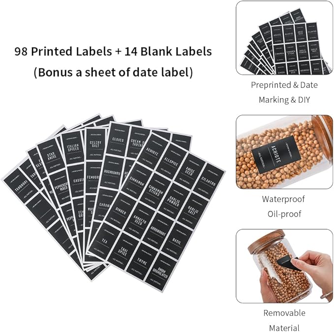 - What You Get - This set include 112 pcs labels (98 printed labels + 14 blank labels) and a marker for you to DIY.