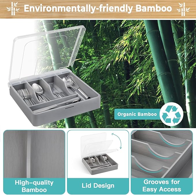 - Sturdy and Durable: The plastic lid is food-grade and100% BPA free. The flatware try is made of bamboo. It's easy to clean by simply being wiped down with a damp cloth.