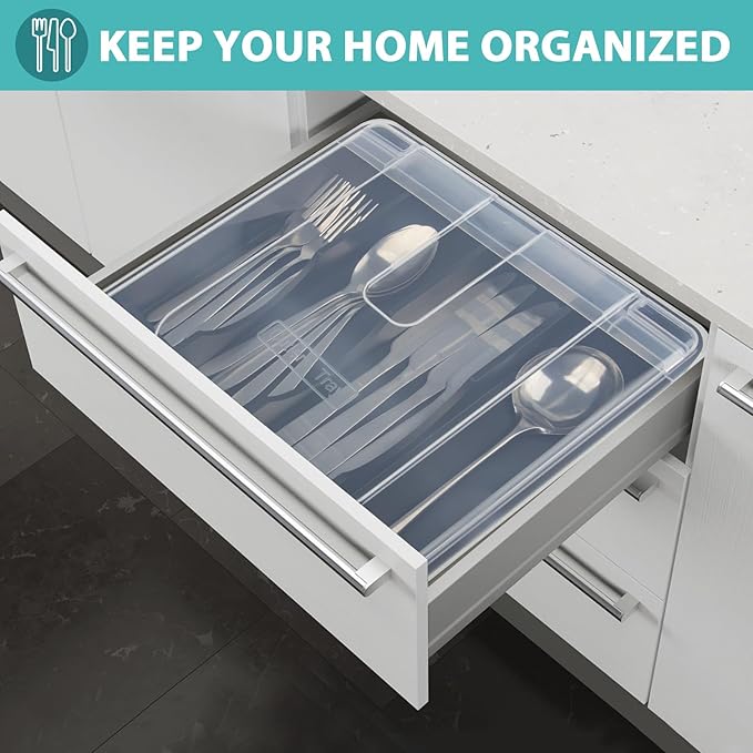 - 5 Generous Compartments: Multi-compartment silverware tray keeps items organized and ready to use; Sort place setting pieces, knives, forks, spoons and other kitchen gadgets.