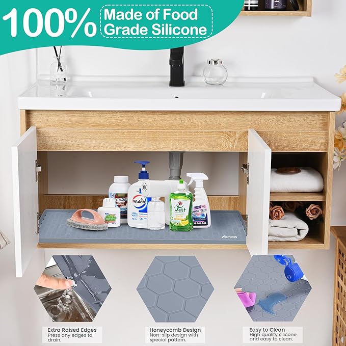 Waterproof Under Sink Mat 28" x 22", Silicone Cabinet Liner, Rubber Protector for Kitchen and Bathroom, Keeps Cabinets Clean, Dry, and Organized (Grey)