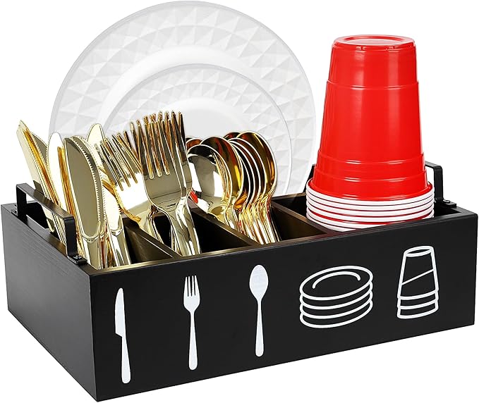 - 【Space Saving】- Our utensil caddy for parties and paper plate holder is not only great for holding flatware, it can also be used for organizing small objects such as office supplies, tools, and more. Perfect for home and RV use. our kitchen wood utensil holder organizer store your utensils in one place, saving you space and time!