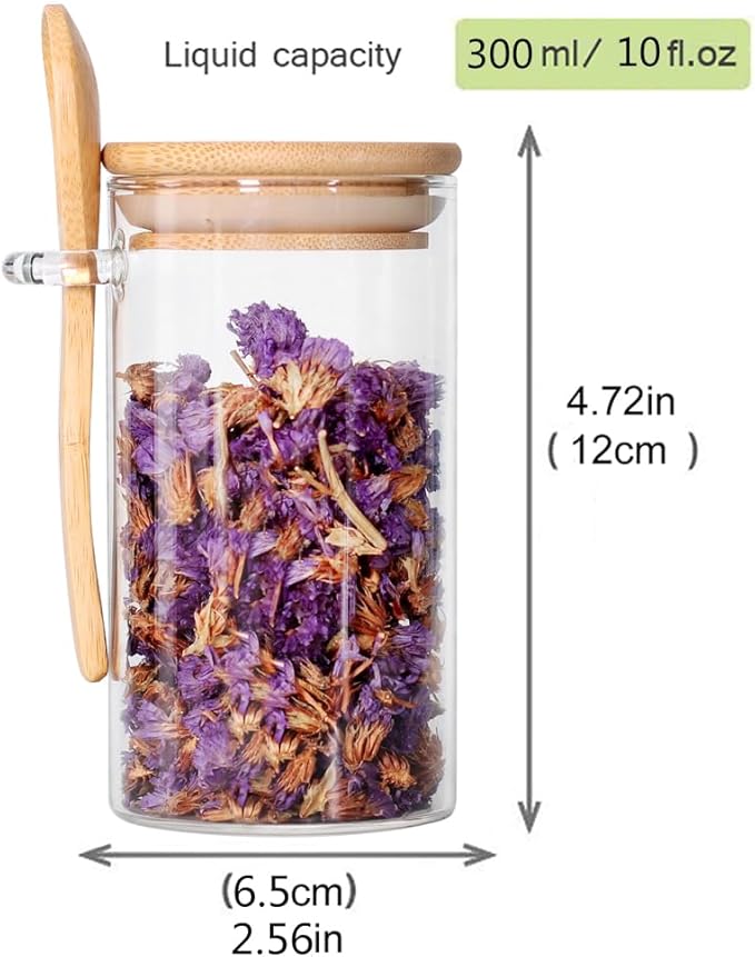 - [Widely Use] The jars with spoon is 2.56inch(6.5cm) X 4.72inch(12cm), you can hold dry or wet food, just like coffee jars for coffee bar, tea jars for loose tea, bath salt containers with lids and scoop.
