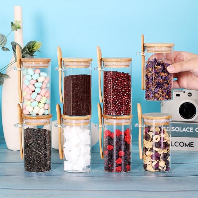 Set of 8 Glass Jars with Bamboo Lids and Spoons, 10 OZ Airtight Small Glass Tea Containers for Loose Tea, Coffee and Sugar Glass Container for Yogurt Jars with Lids
