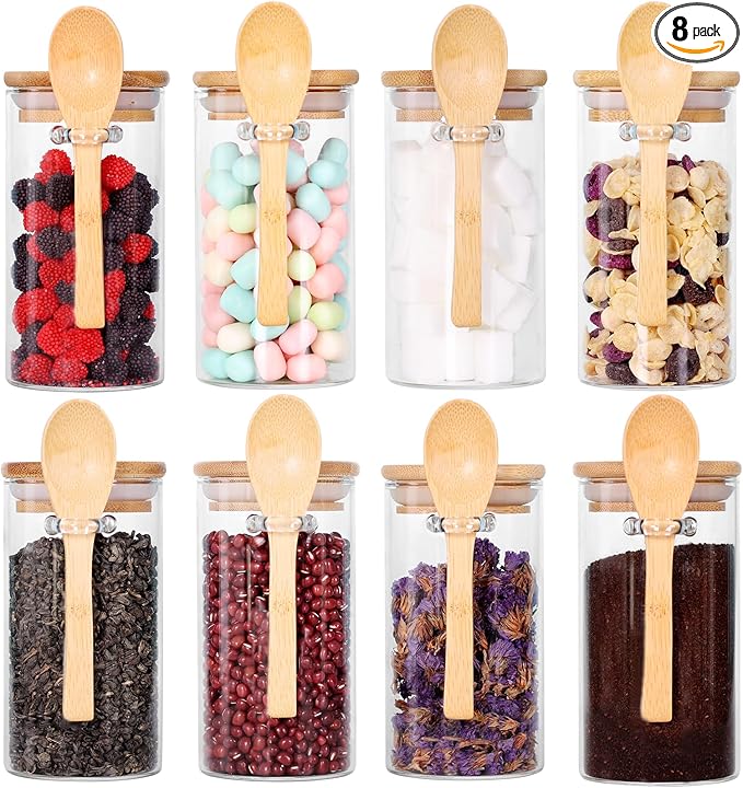 - [Highly Glass] The glass jars with bamboo lids and spoon are made of high-quality borosilicate glass and BPA free silicon which withstand temperature 0℉ to 400℉, you can put this airtight food canister in the pantry, kitchen corner or fridge.