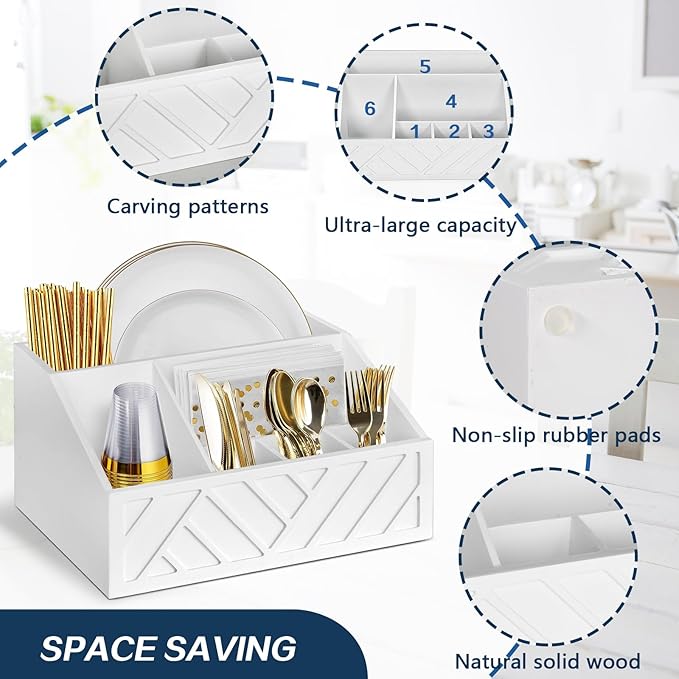 - 【Paper Plate Dispenser Keep Organized】Our kitchen paper plate holder for counter has 6 compartments, which will help you to separate and organize disposable dishes, spoons, forks, knives, napkins, paper cups, straws and condiments. The open top design of wood utensil caddy also makes it easy to organize and easily access all dishes or seasonings. Efficiently and quickly organize and store your kitchen utensils while saving space for your cabinets or drawers by this silverware caddy.