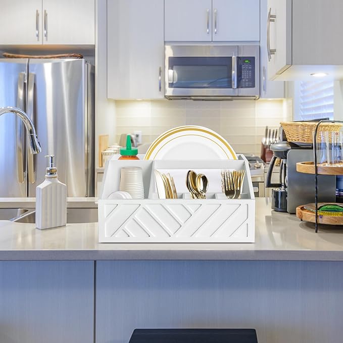 - 【Stylish Paper Plate Holder for Farmhouse Decor】The paper plate organizer are not only practical but also add a touch of elegance to your kitchen. This paper plate and utensil holder caddy with unique carved design and white appearance can elevate the look of any places with its minimalist aesthetic. It’s time to use this stylish utensil organizer caddy to add rustic home decor or modern decor for your home!